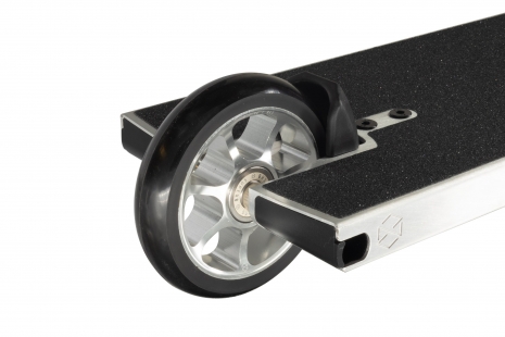 Модель комплектуется термообработанным рулём из хромомолибденовой стали 4130. Дека получила интегрированные алюминиевые декэнды, угол рулевой 83° и фирменный фендер Omni II — всё это увеличивает пространство для ног и снижает контакт колеса с декой. Вилка Format оснащена фирменной самофиксирующейся осью. Колёса Format размером 110 x 24 x 8 мм обеспечивают скорость и контроль. Лёгкий глубокий 7-спицевый сердечник теперь работает в паре с новыми подшипниками SUPER8: шарики на 20% больше, внешний диаметр шире на 27%, а профиль толще на 28% по сравнению со стандартными подшипниками. Итог — меньше деформации, ниже сопротивление качению, более плавный ход, высокая скорость и увеличенный срок службы. SCS стал легче и прочнее, а его конструкция обеспечивает дополнительную поддержку в зоне соединения вилки и рулевой.